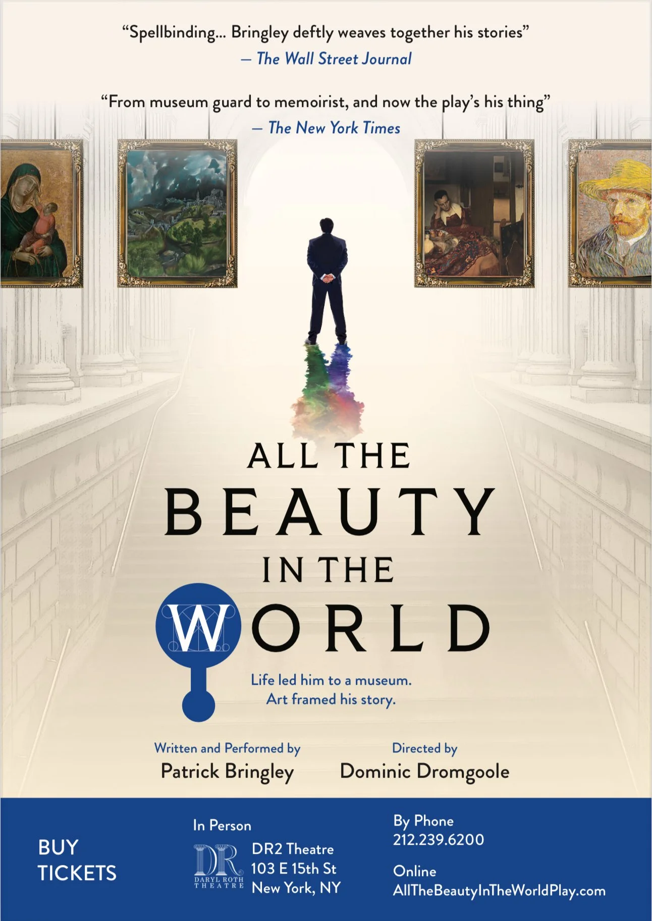 “As a museum guard, I stood quietly in corners and never dreamed I would take center stage,” said Patrick Bringley. “I'm touched by the public's embrace of my memoir — a story about art, an extraordinary workplace, and the fellowship I discovered in the wake of a loss. Performing it as a one-man play is fitting, given a guard’s solitary role. But what excites me most is getting to share moments of epiphany with an audience. After all, a theater, no less than a gallery, is a place for art.”